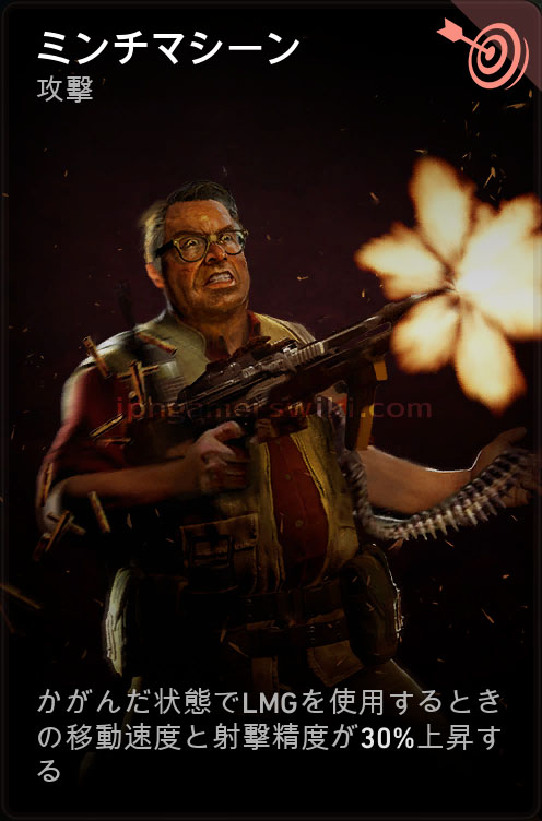 - かがんだ状態でLMGを使用するときの移動速度と射撃精度が30%上昇する