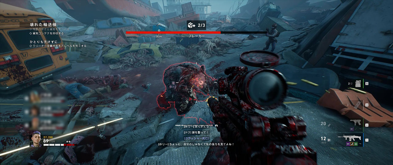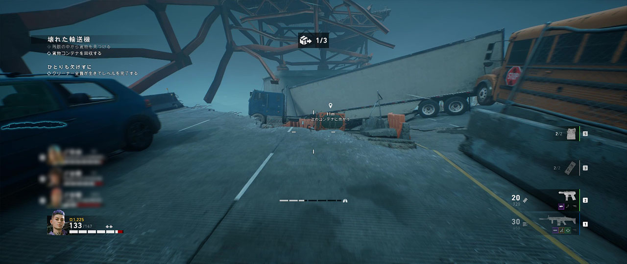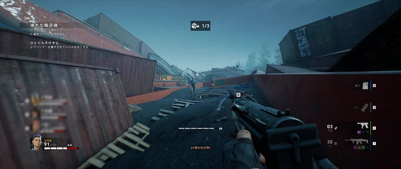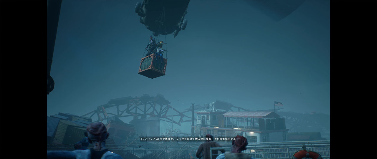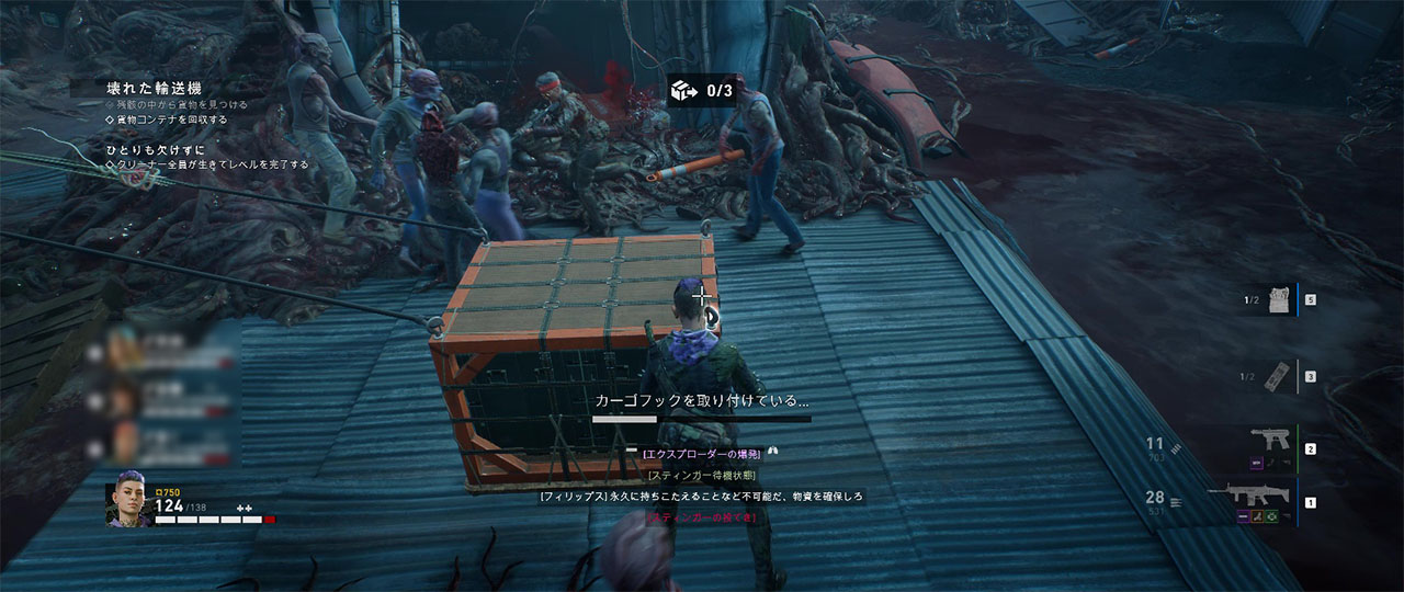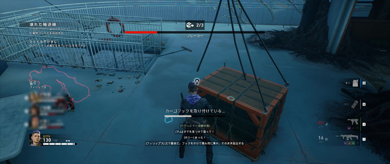 セーフルームを出て船から降りたら、エリア内に3つある貨物コンテナをヘリのフックにつないで回収することになる。コンテナ回収時は大群が発生している中で四隅をそれぞれインタラクトする必要があるため、使用速度を事前に上げておきたい。チームにカーリーがいれば全員の使用速度が上昇するため、スムーズにコンテナを回収しやすい。