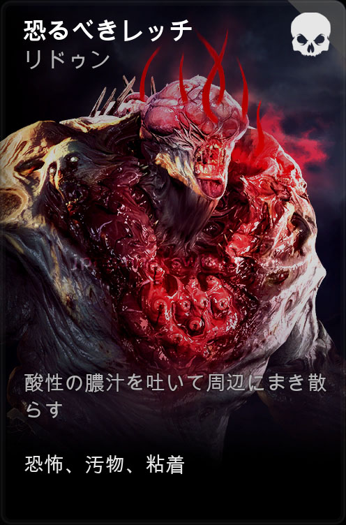 凶暴なレッチの能力に加え、酸に触れてダメージを受けた際に移動速度が大幅に低下するようになる。そのため酸をまともに浴びてしまうとより長時間継続ダメージを受けてしまいやすくなる。大群の発生中に浴びてしまうとまともに移動できず他の敵に囲まれる危険もあるので、遅延耐性のあるエナジードリンクで酸の中から逃げやすくしたり移動速度をある程度上げて酸を避けやすくしておくといい。