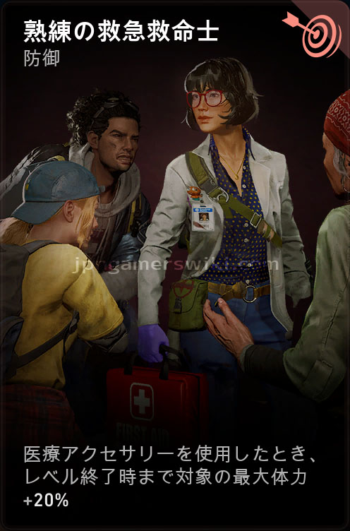 - 医療アクセサリを使用したとき、レベル終了時まで対象の最大体力、スタミナ、スタミナ回復+10%