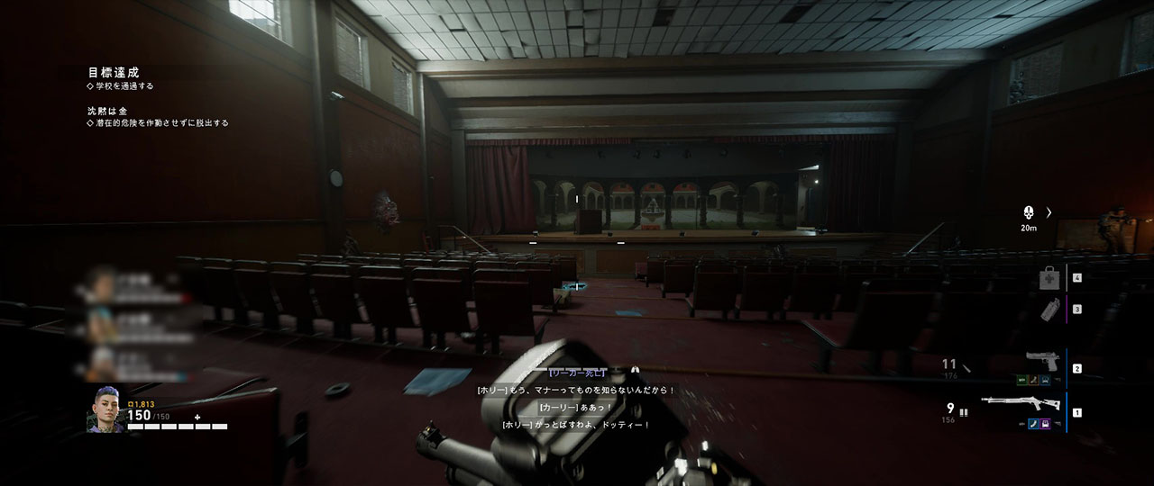 準備ができたら発電機を稼働させる。発電機の稼働中は講堂に続くドアやその脇の窓から敵が大量に出現する。稼働させている観客席の横の観客席の上は籠城しやすいため、ここに固まって敵の大群を迎え撃つといい。