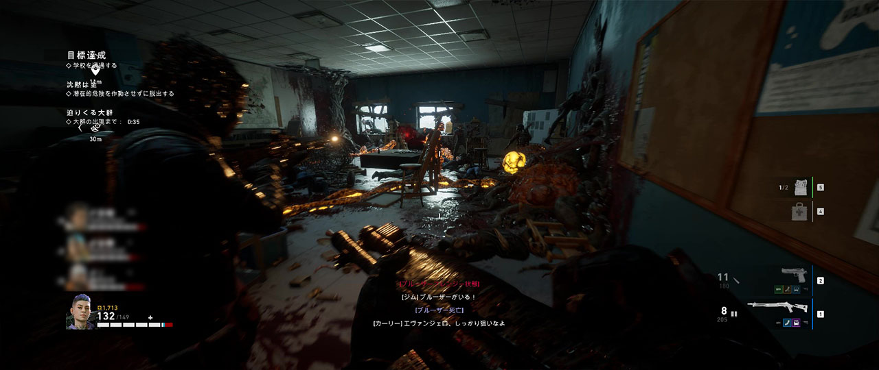 学校に入ったら各部屋を探索しつつ中にあるネストを破壊する。蔦の先を破壊した際の大群は教室に籠れば迎え撃ちやすいが、窓のある部屋だとそこからも敵が出現するため、籠もるなら窓のない部屋がいい。全ての蔦を破壊したら廊下の突き当たりにある最後の核を破壊して先に進む。