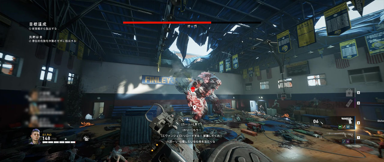 体育館に入ったら中央にある発電機を起動させ、収納されている観客席を前に出す。この時発電機の横にミニガンのケースがあるため、ツールキットで開けて登れる観客席の上に置いておくと後のオーガ戦で役に立つ。