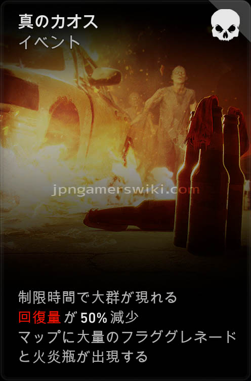 一定時間で大群が発生し、回復効率が50%減少し、マップに大量の火炎瓶とフラググレネードが配置される。