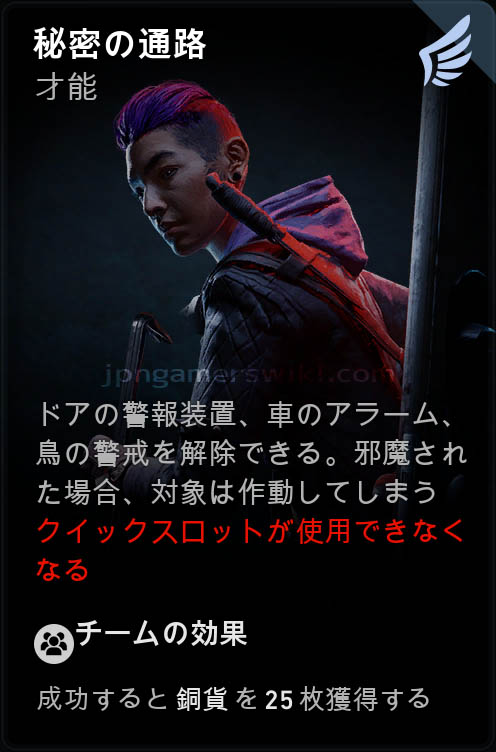 - ドアの警報装置、車のアラーム、鳥の警戒を解除できる。邪魔された場合、対象は作動してしまう