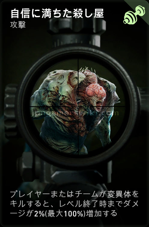 - プレイヤーまたはチームが変異体をキルすると、レベル終了時までダメージが1% (最大15%) 増加する