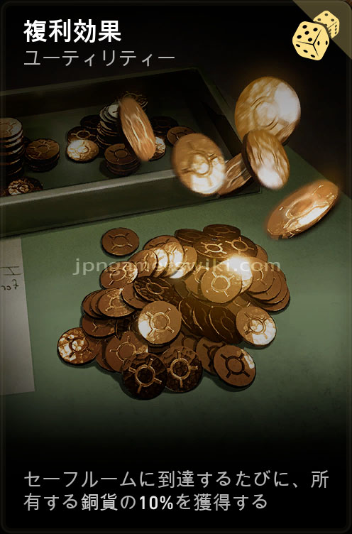 効果を最大限に活かすにはレベル開始時に大量の銅貨を保持している必要があるため、他の銅貨獲得系のカード複数枚と併用することが望ましい。銅貨の総量があまり多くない序盤に有効化してもそれほど効果を発揮できないため、序盤のドローは