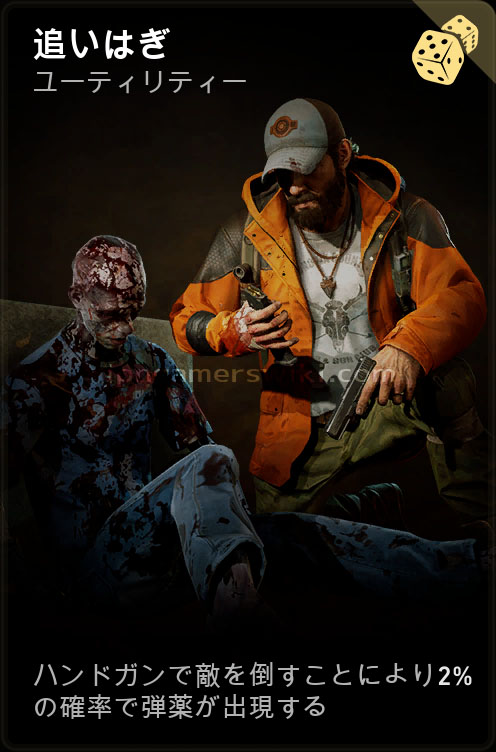 - サブ武器の銃で敵を倒すことにより5%の確率で弾薬、火炎瓶、または餌入り瓶が出現する