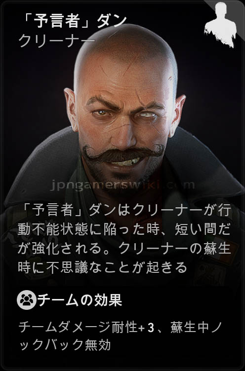 - 「預言者」ダンは、他のクリーナーが行動不能状態に陥ったとき、戦闘能力が上昇する