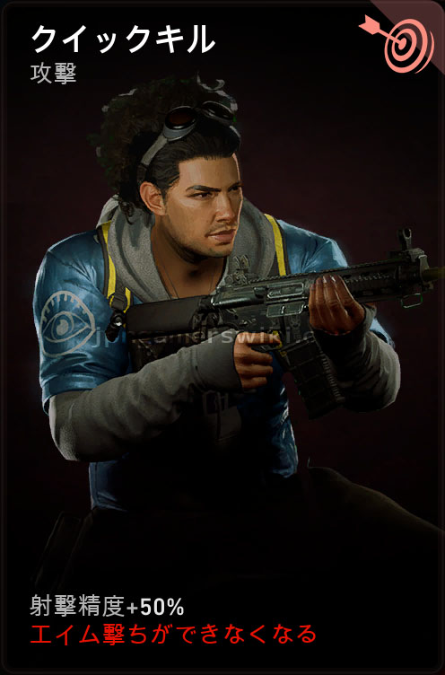 ADSを捨てて腰だめに特化するカード。常に視野を広く持てるようになるため、アグレッシブに動き回るなら非常に効果的。その代わり、ボルトアクションのスナイパーライフルは実用的ではなくなってしまうため、遠距離にいる変異体を迅速に処理するのは難しくなる。