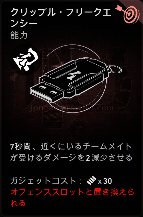 - 7秒間、近くにいるチームメイトが受けるダメージを1減少させる