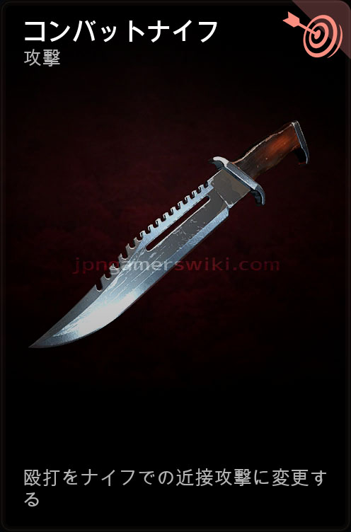 ナイフは単体に対して非常に強力な反面、素手での殴打と比べて攻撃範囲が非常に狭く、敵に囲まれた際にそれらを押しのけることができなくなってしまうのが難点。この点をカバーするためにも、フラググレネードフラッシュバンなどは常に携帯しておきたい。