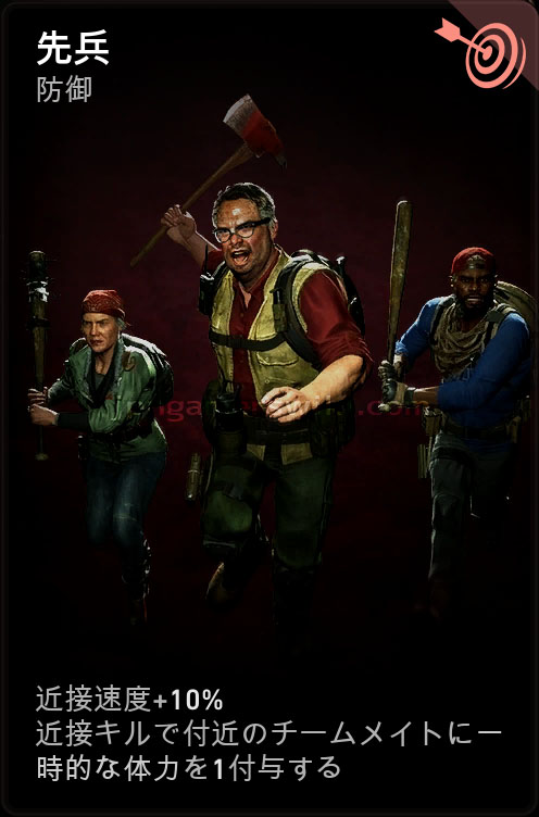- 近接キルで自分と10メートル以内のチームメイトの体力が1回復する