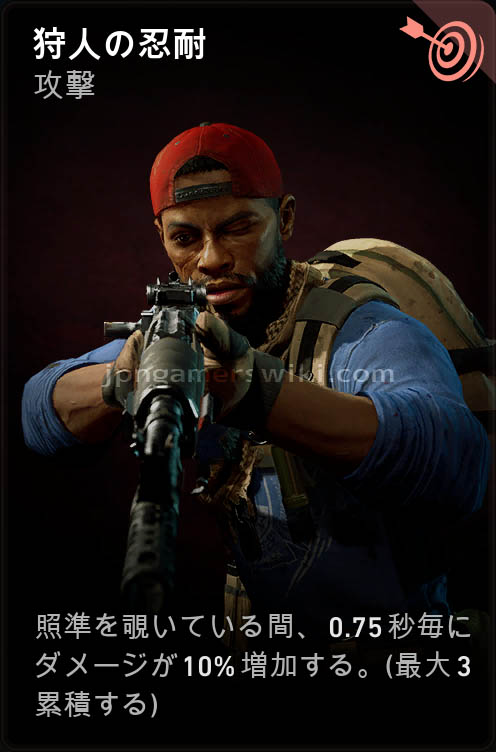 - 照準を覗いている間、0.75秒ごとにダメージが10%増加する。 (最大で3累積する)