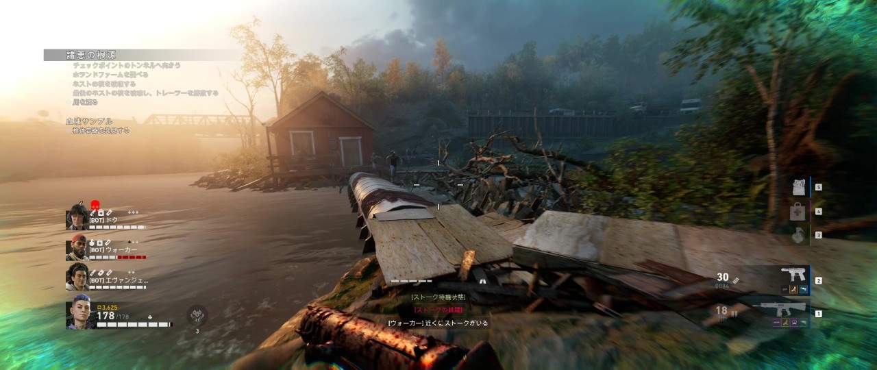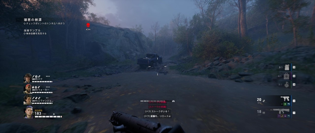 セーフルームを抜けると高低差のある岩場と森を抜けることになる。視界が悪い上に初期配置のコモンリドゥンも多く、うっかりすると囲まれやすい。周囲をクリアリングしながら慎重に進むか、もしくはスタミナが十分にあるなら一気に下のトラックがあるところまでダッシュしたほうがいい。いずれにせよチームメイトと距離が離れすぎないよう注意が必要。
