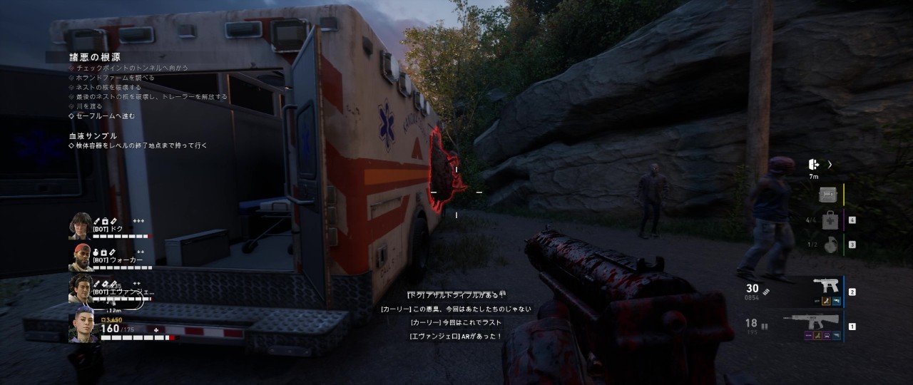 川を渡った正面にある小屋には窓から入ることができる。色々とアイテムが配置されるので余裕があれば漁っておくといい。そのまま道なりに進むとセーフルームがあり、その手前の救急車周辺にもいくらかアイテムが配置される。この時、救急車の側面にスリーパーがいることもあるので油断しないように。