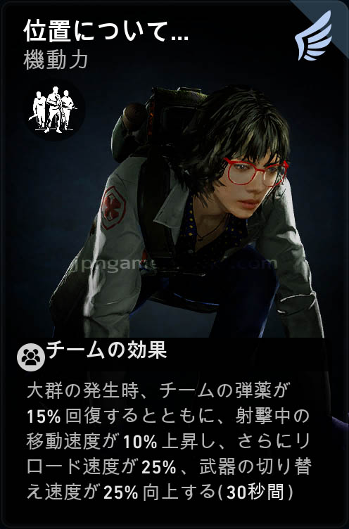 大群発生時、チームの弾薬が7.5%回復するとともに、射撃中の移動速度が10%上昇し、さらにリロード速度が15%、武器の切り替え速度が25%向上する (30秒間)