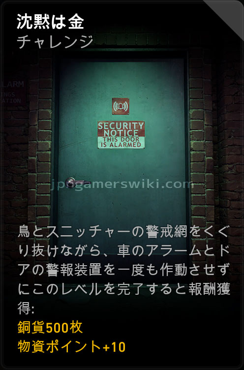 | 沈黙は金 - サバイバル Silence is Golden - Survival | チャレンジ | 鳥とスニッチャーの警戒網をくぐり抜けながら、車のアラームとドアの警報装置を一度も作動させずに全員生存している状態でこのレベルを完了すると報酬獲得: 銅貨500枚 物資ポイント+10 |