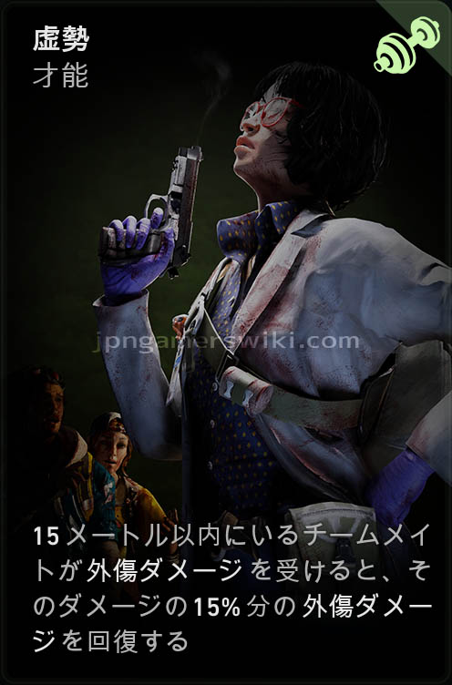 - 15メートル以内にいるチームメイトが外傷ダメージを受けると、そのダメージの15%分の外傷ダメージを回復する