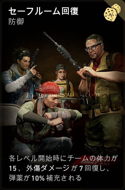 - 各レベル開始時にチームの体力が15、外傷ダメージが7回復し、弾薬が10%補充される