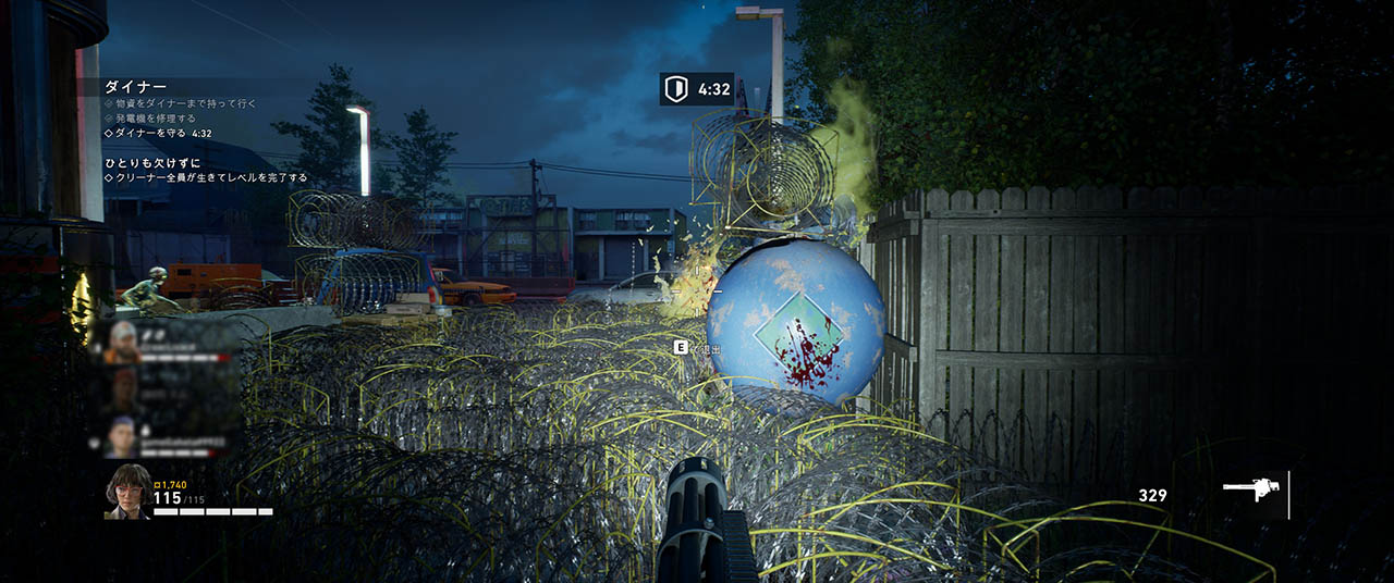 電動ゲートを過ぎてガレージを抜けるとダイナーが見える。持ってきた物資箱をダイナー前に敷かれた防衛陣地に置くと大量の物資が展開される。中央にあるジェネレータを起動すると長時間の防衛戦が始まるので、その前に周囲に有刺鉄線を張ったり、対変異体用にミニガンを設置したりと準備をしておこう。