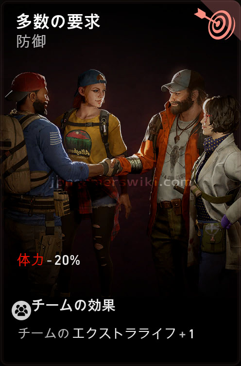 デフォルトのエクストラライフが少ない高難易度ほど有用なカード。ただしデメリットの体力減少がそこそこ大きいため、増えた分のエクストラライフを無駄にしないよう、体力最大値を強化するカードも一緒にセットしておいたほうがいい。また、制御尊い犠牲制御仇討ちなど、ダウン発動系のカードを併せて使えば、増えたエクストラライフをより活かせる。