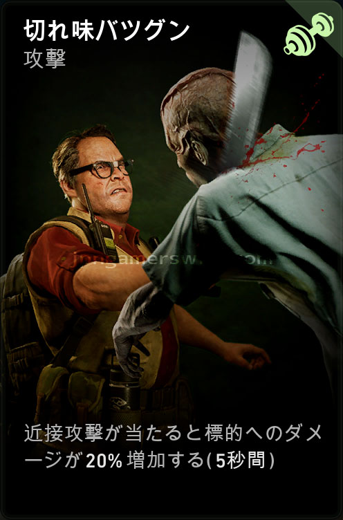 主に体力の高い変異体に対して効果を発揮するカードではあるが、変異体に近づくのは非常にリスクの高い行動であるため、中々に使い所が難しいカード。消防斧は変異体に対しても怯みを誘発させ安全に殴れるので、見つけたら拾っておきたい。近接特化デッキに組み込むほか、射撃系のデッキでも殴打での発動をメインにして運用することが出来る。