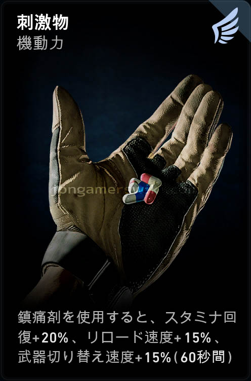 カテゴリ:アクティブカード 瞬発性 機動力 鎮痛剤発動 スタミナ回復 リロード速度 武器切り替え速度