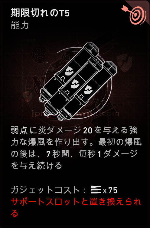 - 元の効果:弱点に毎秒8の炎ダメージを与える霧を散布する。