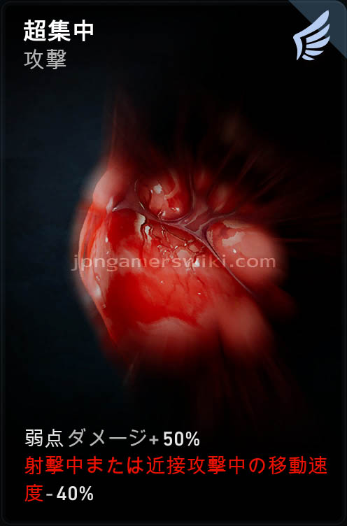 - 2021/12/17のアップデートで、デメリットが「照準を覗いている間の移動速度-75%」から「射撃中または近接攻撃中の移動速度-40%」に変更された。
