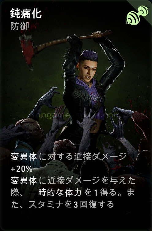 - 変異体に近接ダメージを与えた際、体力を2得る。また、スタミナを3回復する