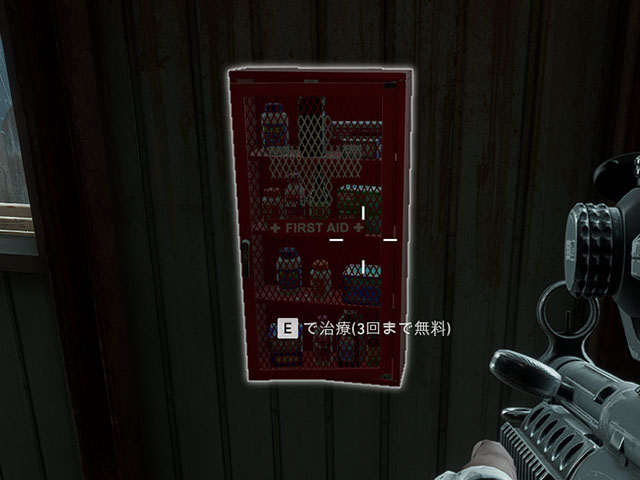 医療キャビネットは各レベルに配置されるインタラクト可能なオブジェクトの1つで、使用すると体力および外傷、エクストラライフを治療することができる。