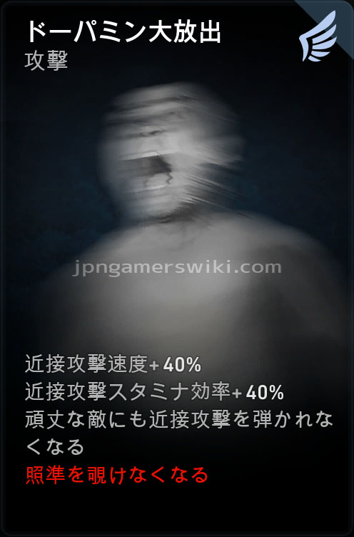 - 近接攻撃を行うごとに近接速度を5%、近接スタミナ効率を5%与える (6秒間) 。この効果は最大10回まで累積する