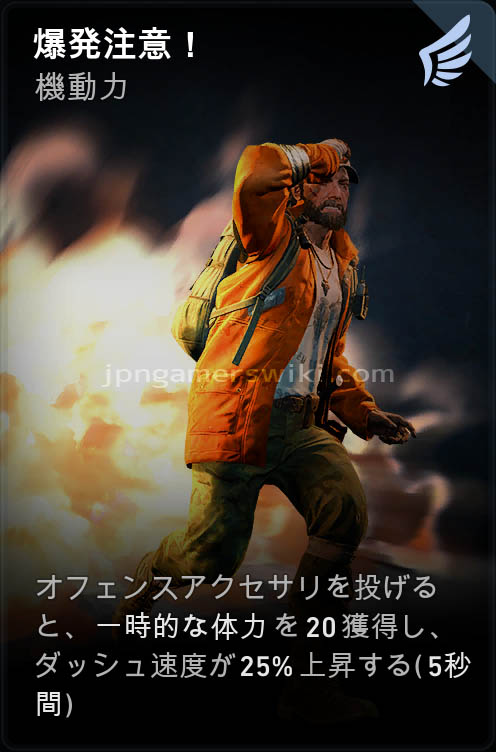 - オフェンスアクセサリを投げると、一時的な体力を20獲得し、ダッシュ速度が25%上昇する (5秒間)