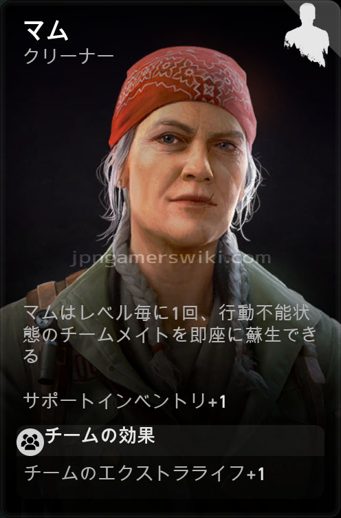 - マムがレベル毎に1回、行動不能状態のチームメイトを即座に蘇生できる