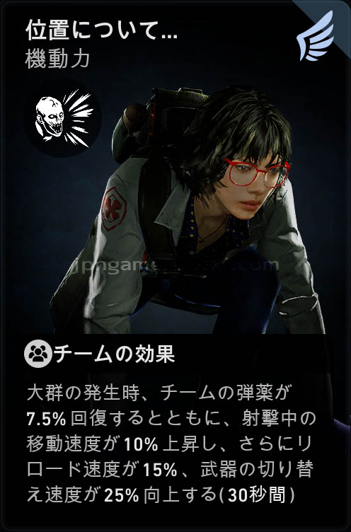 大群発生時、チームの弾薬が7.5%回復するとともに、射撃中の移動速度が10%上昇し、さらにリロード速度が15%、武器の切り替え速度が25%向上する (30秒間)