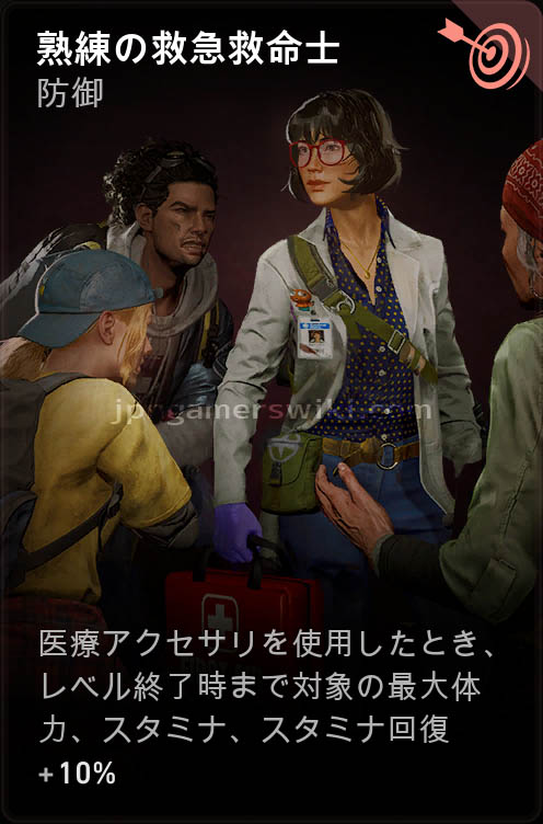 - 医療アクセサリを使用したとき、レベル終了時まで対象の最大体力、スタミナ、スタミナ回復+10%