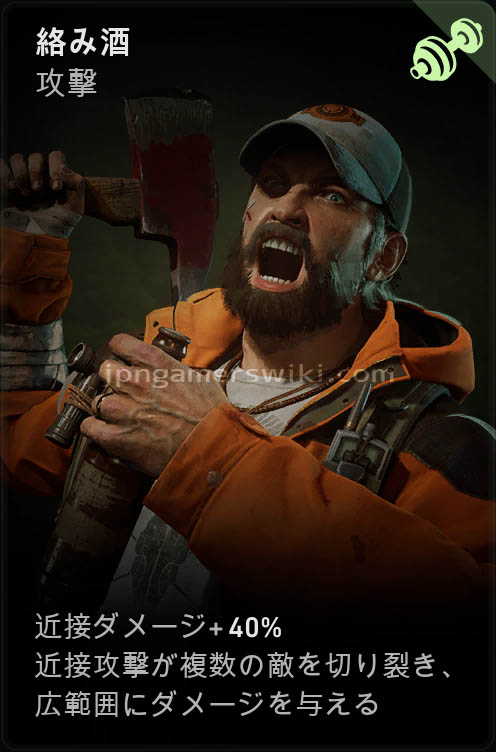 近接ダメージの上昇幅は大きいが、その分デメリットも強烈な1枚。採用するなら移動速度の強化は必須のため扱いづらいが、ダッシュしなくていい分、近接攻撃時のスタミナ管理が楽になるという側面もある。