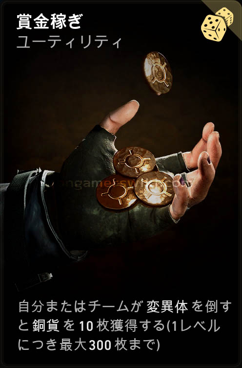 - 自分またはチームが変異体を倒すと銅貨を10枚獲得する (1レベルにつき最大300枚まで)