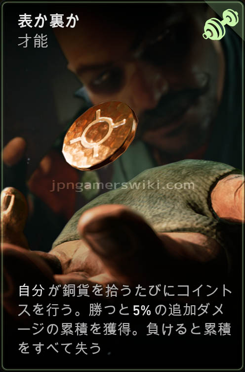 自分が銅貨を拾うたびにコイントスを行う。勝つと5%の追加ダメージの累積を獲得。負けると累積をすべて失う