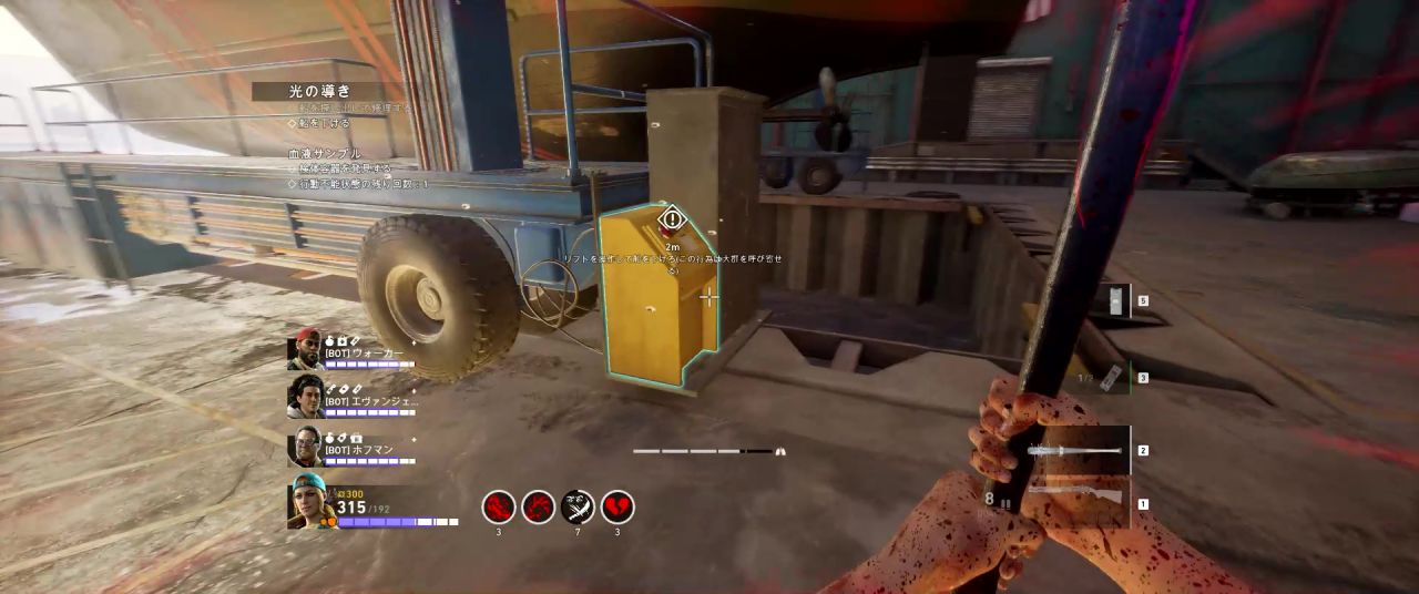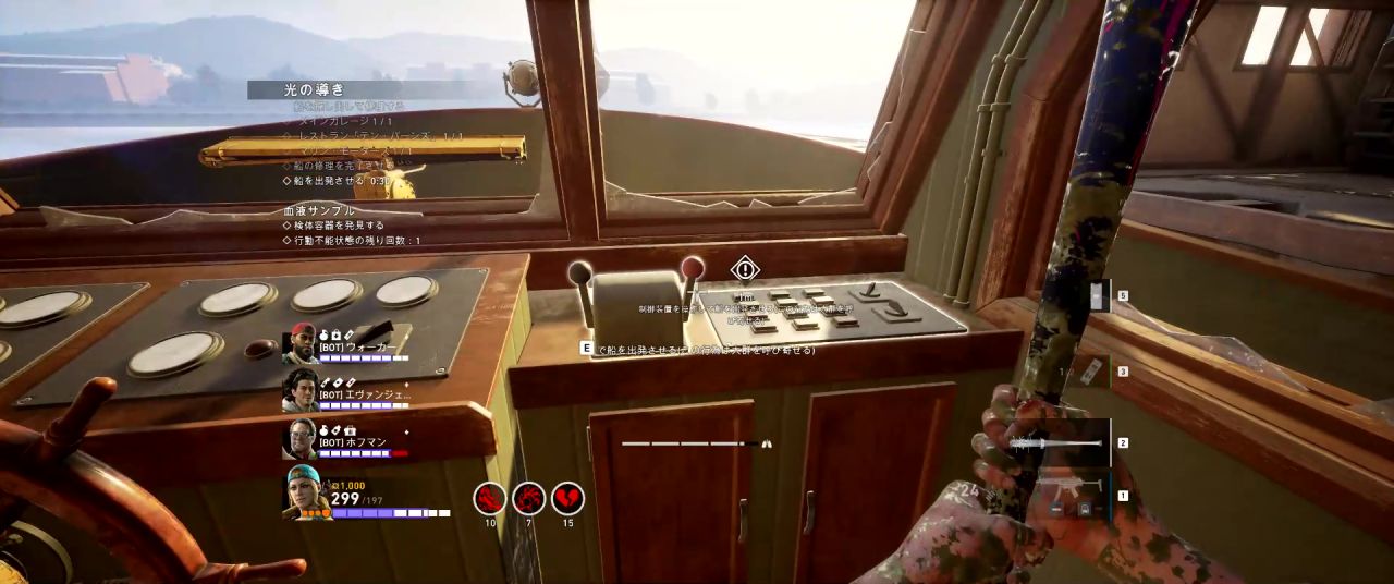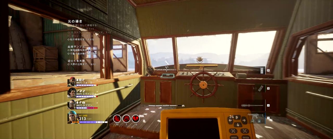 船に持ち帰った部品はそれぞれ指定された場所に取り付け、すべての部品を揃えたら操舵室の横にある操作盤をインタラクトして船を発進させる。船の発進には30秒かかり、その後全員が船に乗っていればクリアとなる。操作盤に触れた後はクリアまで無限に大群が発生するため、取り残したアイテム等がある場合は先に拾っておくといい。
