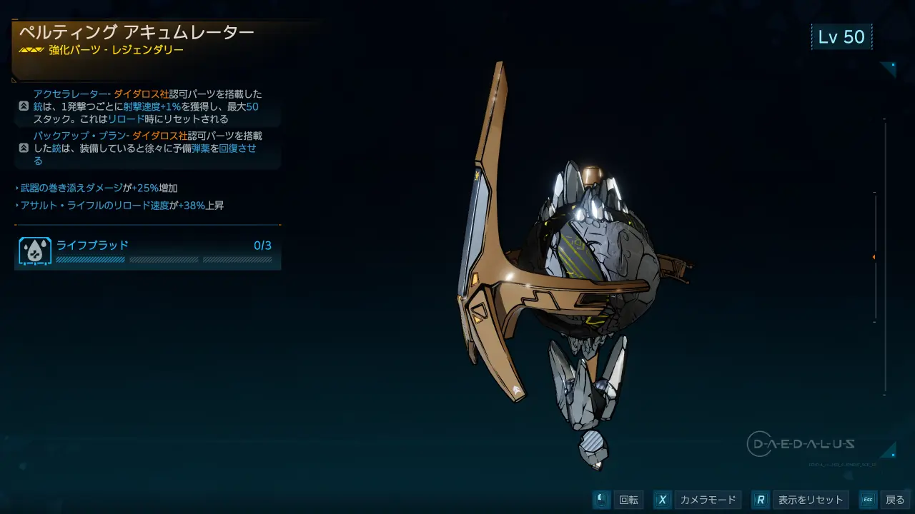 レジェンダリー強化パーツ。ダイダロス製の武器やダイダロス製の認可パーツが装着された武器に効果が適用される。