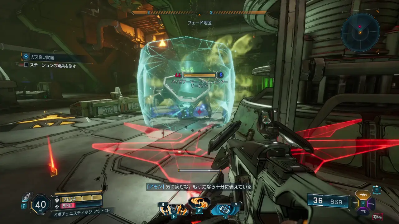 バリアを2枚解除すると、最後に奥からバイオアーマー・ディフェンダーが登場する。このディフェンダーは生体装甲を纏っているので、近くの散布機からイナゴガスキャニスターを拾って投げつけ、装甲を無効化しつつ戦おう。
