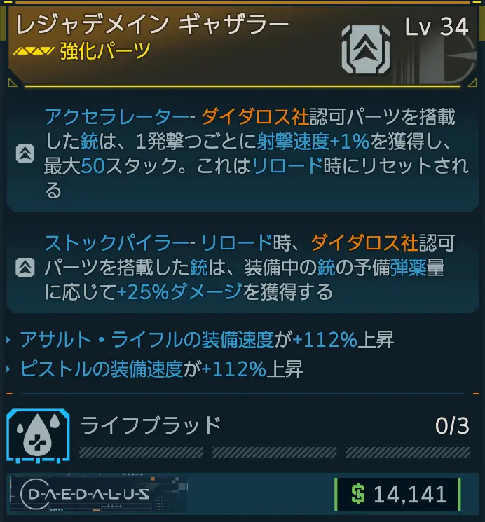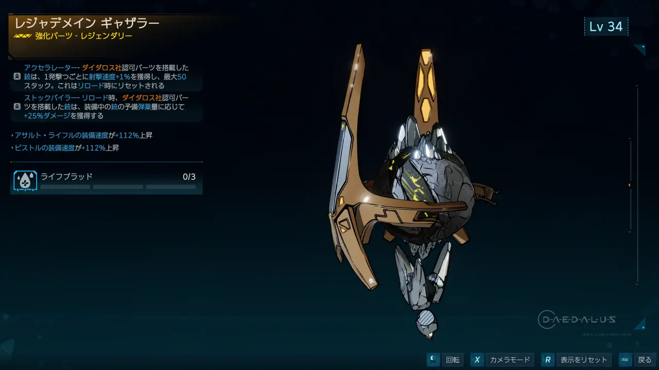 レジェンダリー強化パーツ。ダイダロス製の武器やダイダロス製の認可パーツが装着された武器に効果が適用される。