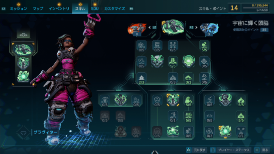 想定レベルは36とありますがこれはグループワークの取得のためであり、これを取らないのであれば最低レベルは27レベルで実現可能です。余ったポイントはお好きなように振り分けましょう。個人的にはアクリーションやメルトダウンなど、宇宙に輝く頭脳のツリーで完結させるのが今のところよいと思います。