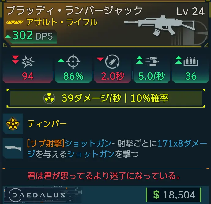 ダイダロス社製のレジェンダリー・アサルト・ライフル。フェードフィールドの崇拝者の締め縄にあるリッパーの掘削現場「ピット・ステイン」で出現するファウンドリー・フリークスがドロップする。