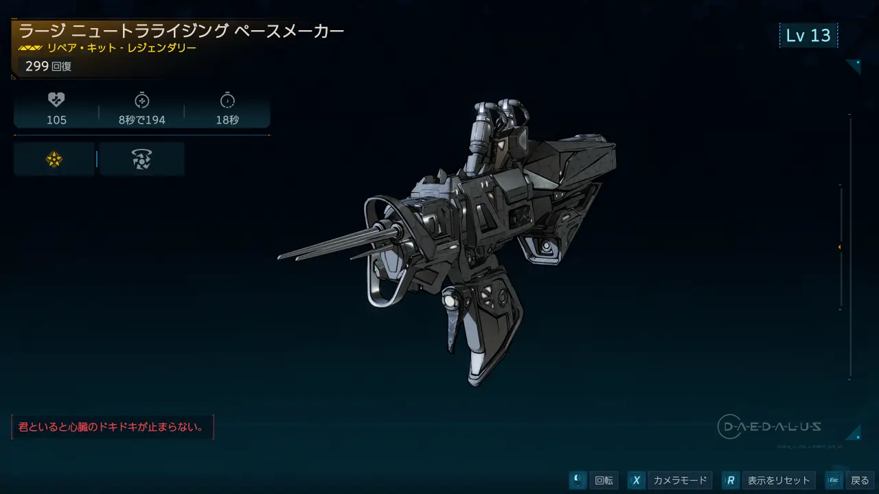 ダイダロス社製のレジェンダリー・リペア・キット。フェードフィールドでのメイン・ミッション「落ちぶれアウトバウンダーズ」で登場するホレイスがドロップする。