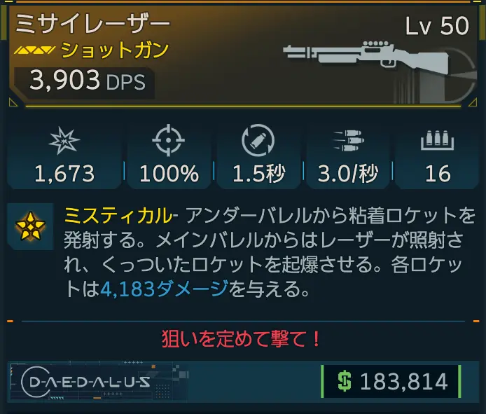 | ミスティカル - アンダーバレルから粘着ロケットを発射する。メインバレルからはレーザーが照射され、くっついたロケットを起爆させる。各ロケットは4,183ダメージを与える | |