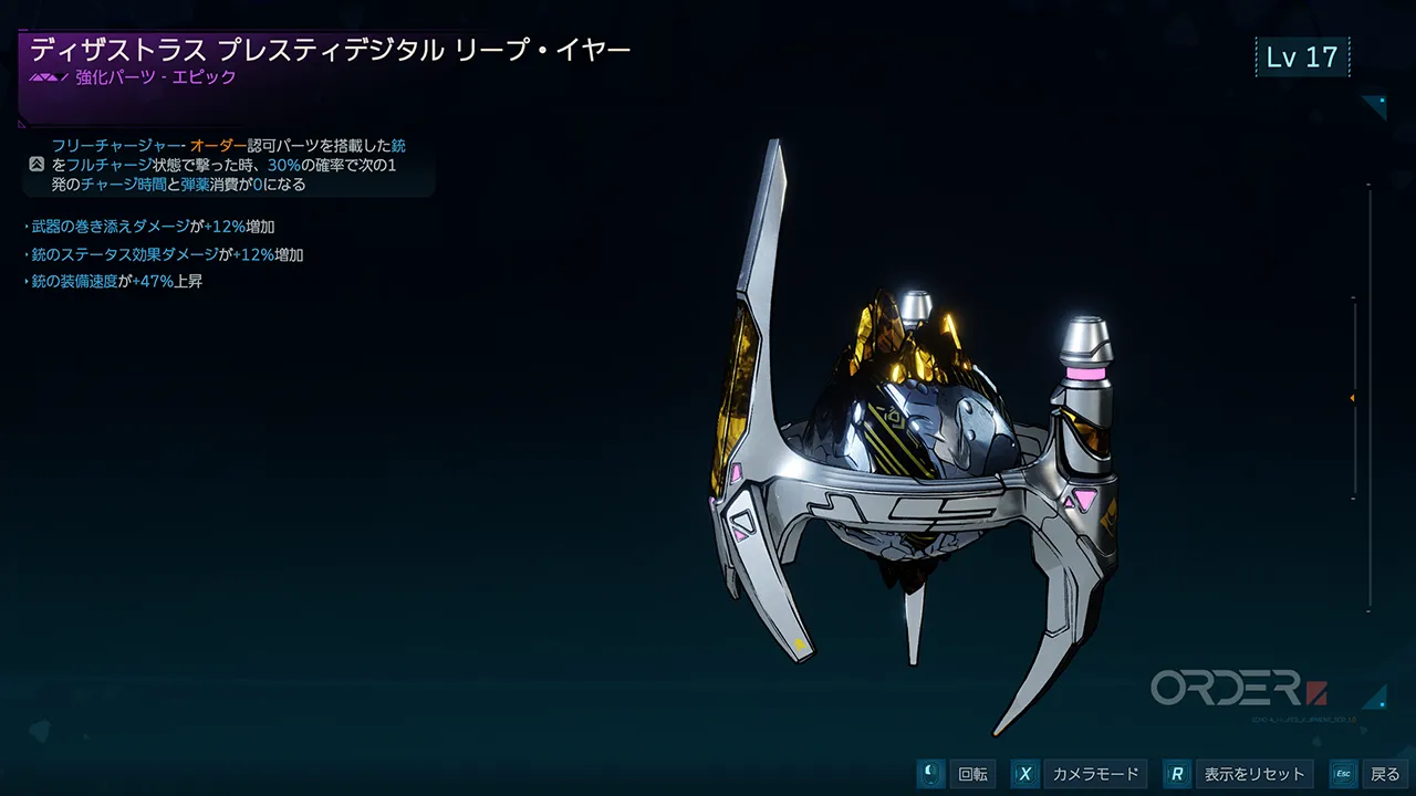使用中の武器にオーダー社のパーツが付いていれば、フルチャージ後の次の1発が30%の確率で即座にフルチャージ状態になり、弾も消費しない。