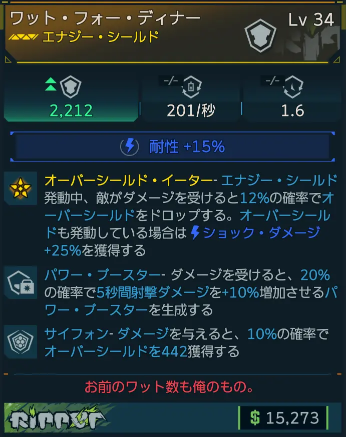 シールド発動中、敵にダメージを与えると12%の確率でオーバーシールドをドロップする。オーバーシールド発動中、